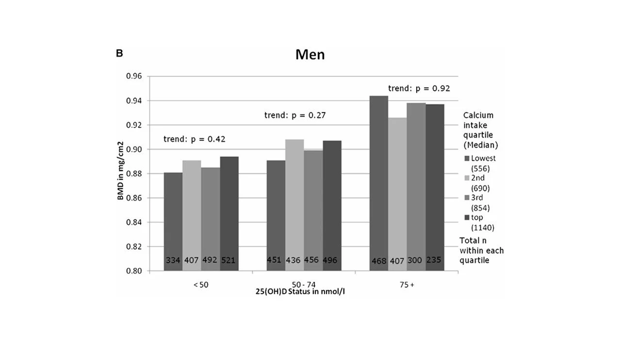 US NHANES study in 10,000 adults. Men’s total hip BMD by calcium intake categorised by serum vitamin D status. (B) quartiles: <lowest 626 mg/d; second = 627–761 mg/d; third = 762–962 mg/d; top = 963–2152 mg/d. Controlling for calcium intake, age (10-yr age categories), race/ethnicity (white, black, Mexican Amer ican), body mass index, height, total calorie intake, physical activity, smoking, and socio economic status.These relationships held this relationship held regardless of age group.