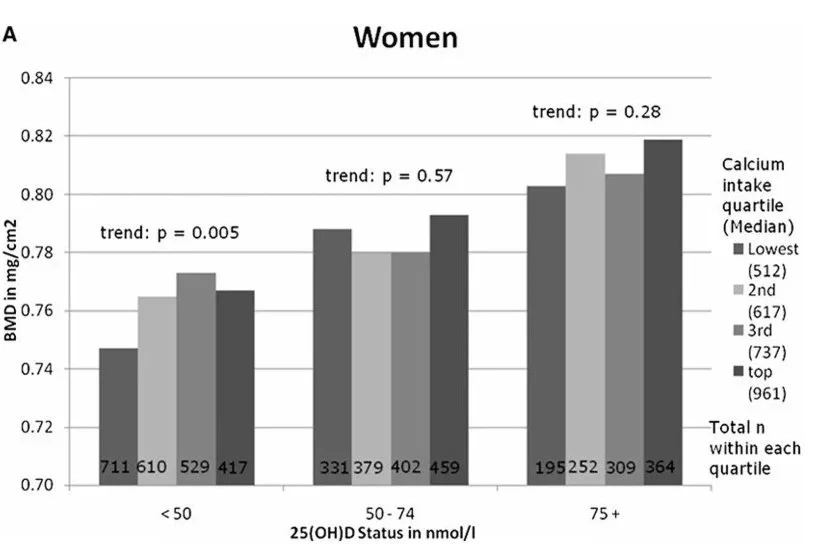 US NHANES study in 10,000 adults. Women’s total hip BMD by calcium intake categorised by serum vitamin D status. (A) quartiles: lowest <566 mg/d; second = 567–671 mg/d; third = 672–825 mg/d; top = 826–2143. Controlling for calcium intake, age (10-yr age categories), race/ethnicity (white, black, Mexican American), body mass index, height, total calorie intake, estrogen use among women, physical activity, smoking, and socio-economic status. These relationships held this relationship held regardless of age group.