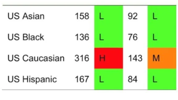 Controlling as best we can for other variables, race is clearly a determinant with Caucasians most vulnerable. Below is the US age-standardised fracture rate per 100,000 population for women (left) and men (right).